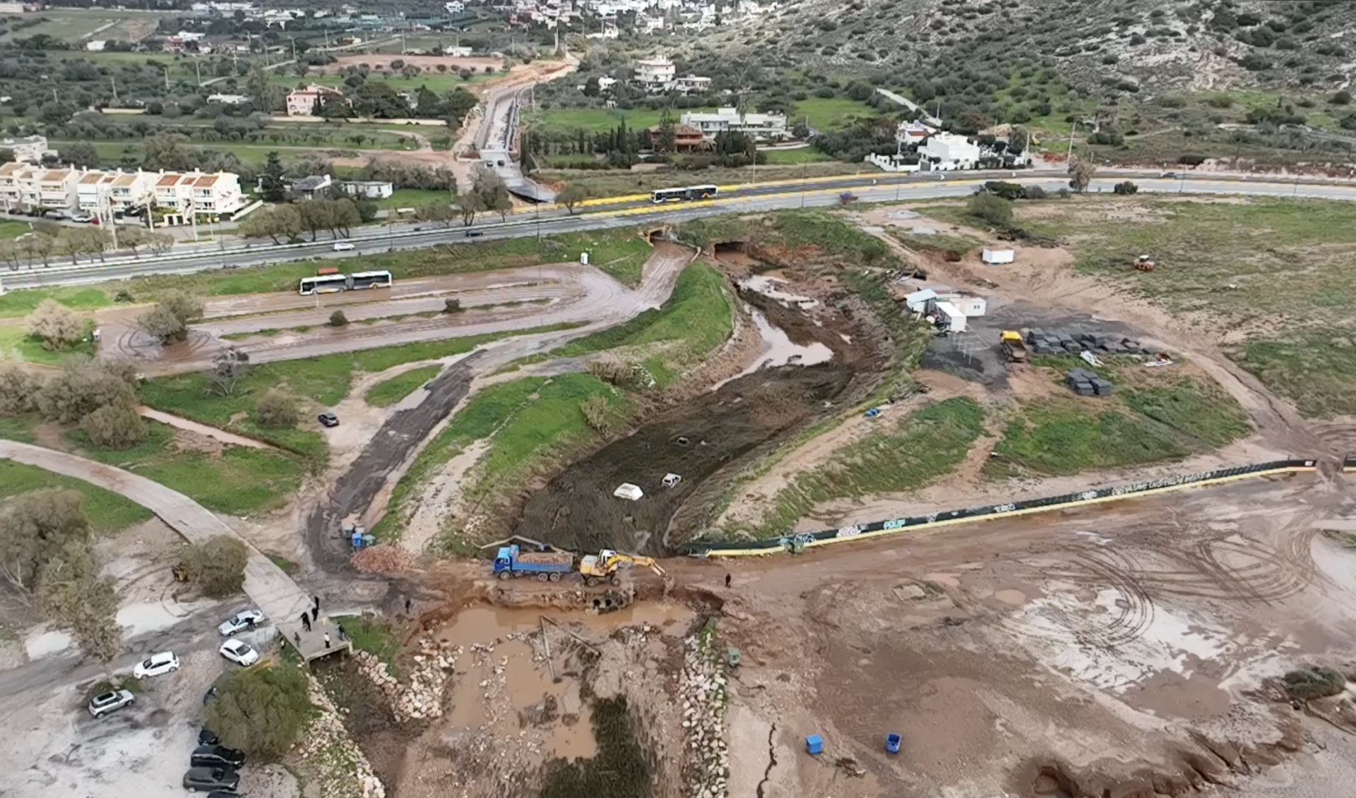 Ωστόσο, το παρατεταμένο αυτό χρονικό κενό είχε απτές επιπτώσεις στην καθημερινότητα των κατοίκων. Όπως προκύπτει και από τα πλάνα drone, στα τμήματα του έργου που έχουν ήδη ολοκληρωθεί δεν καταγράφονται προβλήματα. Αντίθετα, στα σημεία όπου το έργο παραμένει ανολοκλήρωτο, έχουν σημειωθεί περιστατικά με πλημμυρισμένα υπόγεια κατοικιών, επιβεβαιώνοντας τον κρίσιμο ρόλο του έργου στην αντιπλημμυρική θωράκιση της περιοχής.