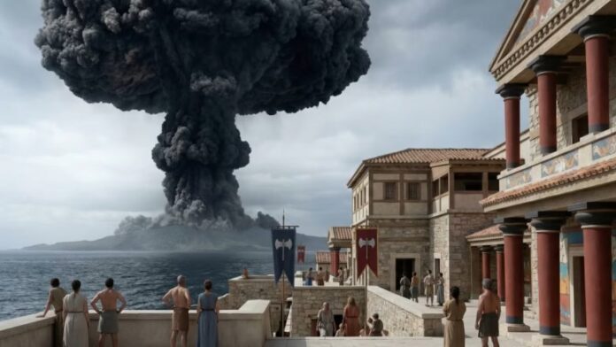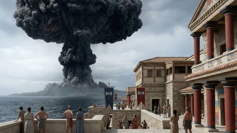 Στο βίντεο με την εντυπωσιακή αναπαράσταση, σημειώνεται ότι ο Μινωικός πολιτισμός βρέθηκε αντιμέτωπος με δύο μεγάλες καταστροφές: μια ισχυρή ηφαιστειακή έκρηξη και στη συνέχεια εισβολή πολεμιστών από την ηπειρωτική Ελλάδα, γεγονότα που συνέβαλαν στην παρακμή του.
