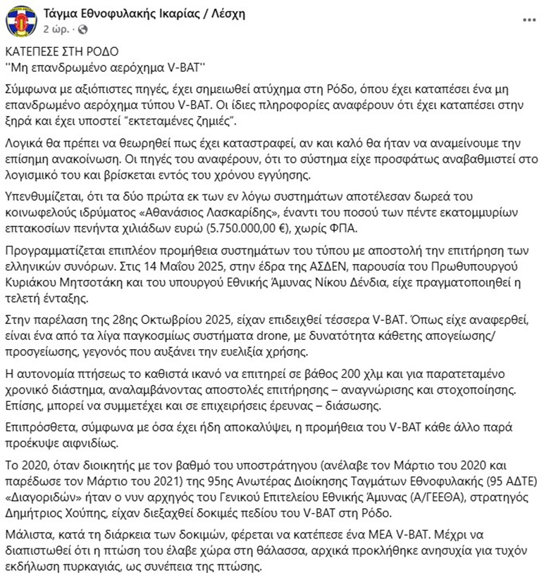 Ένα μη επανδρωμένο αερόχημα τύπου V-BAT φαίνεται να έχει καταπέσει στη Ρόδο, σύμφωνα με ανάρτηση που δημοσίευσε το «Τάγμα Εθνοφυλακής Ικαρίας» στο Facebook το βράδυ της Πέμπτης, 22 Απριλίου.