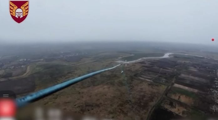 Στη συνέχεια το ουκρανικό drone φαίνεται να πετάει πάνω από τον στόχο του, με το σχοινί να μπλέκεται στους έλικες του ρωσικού μη επανδρωμένου αεροσκάφους.