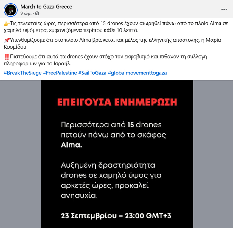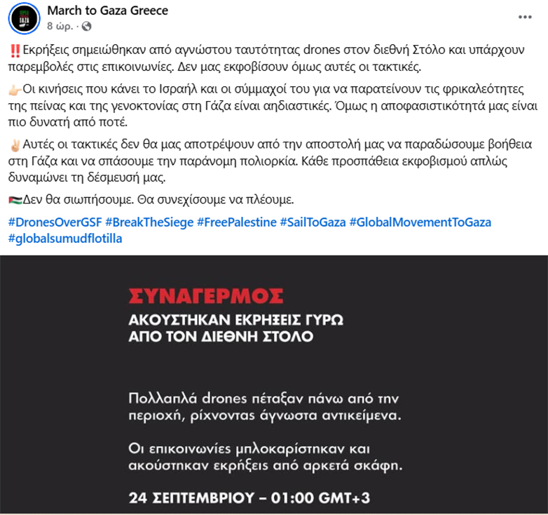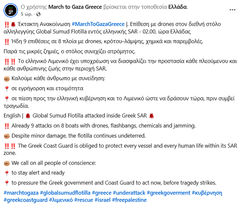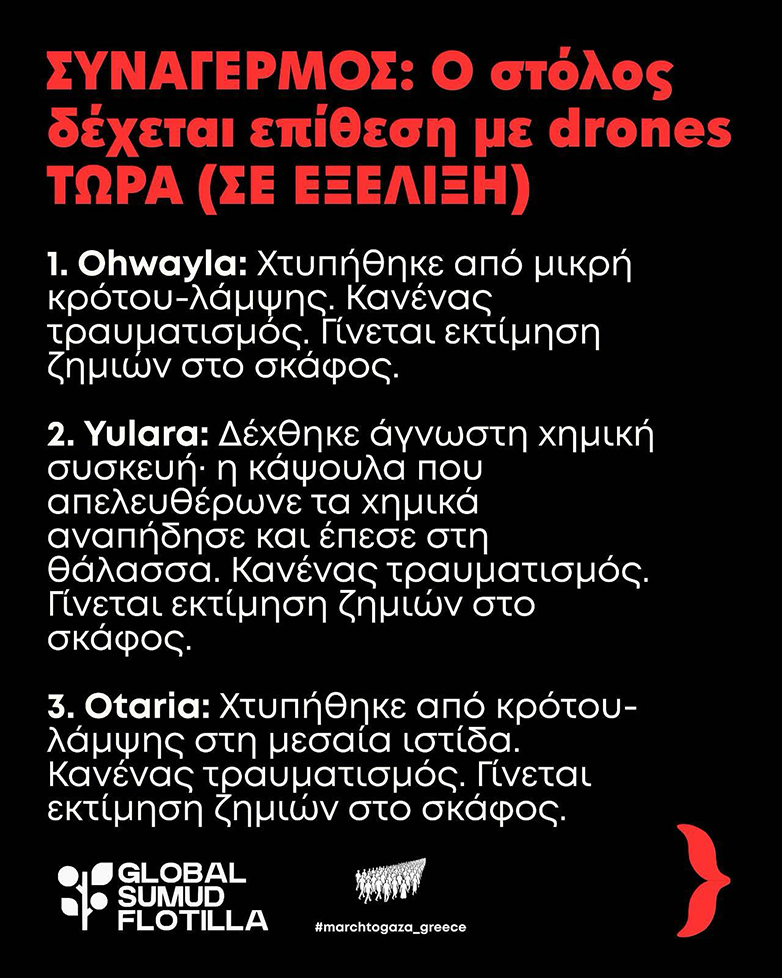 Επίθεση από drones που έριξαν φωτοβολίδες κρότου λάμψης και χημικά δέχθηκαν τα πλοία του «Στόλου για τη Γάζα» (Global Sumud Flotilla) τα ξημερώματα, ανοιχτά της Κρήτης.